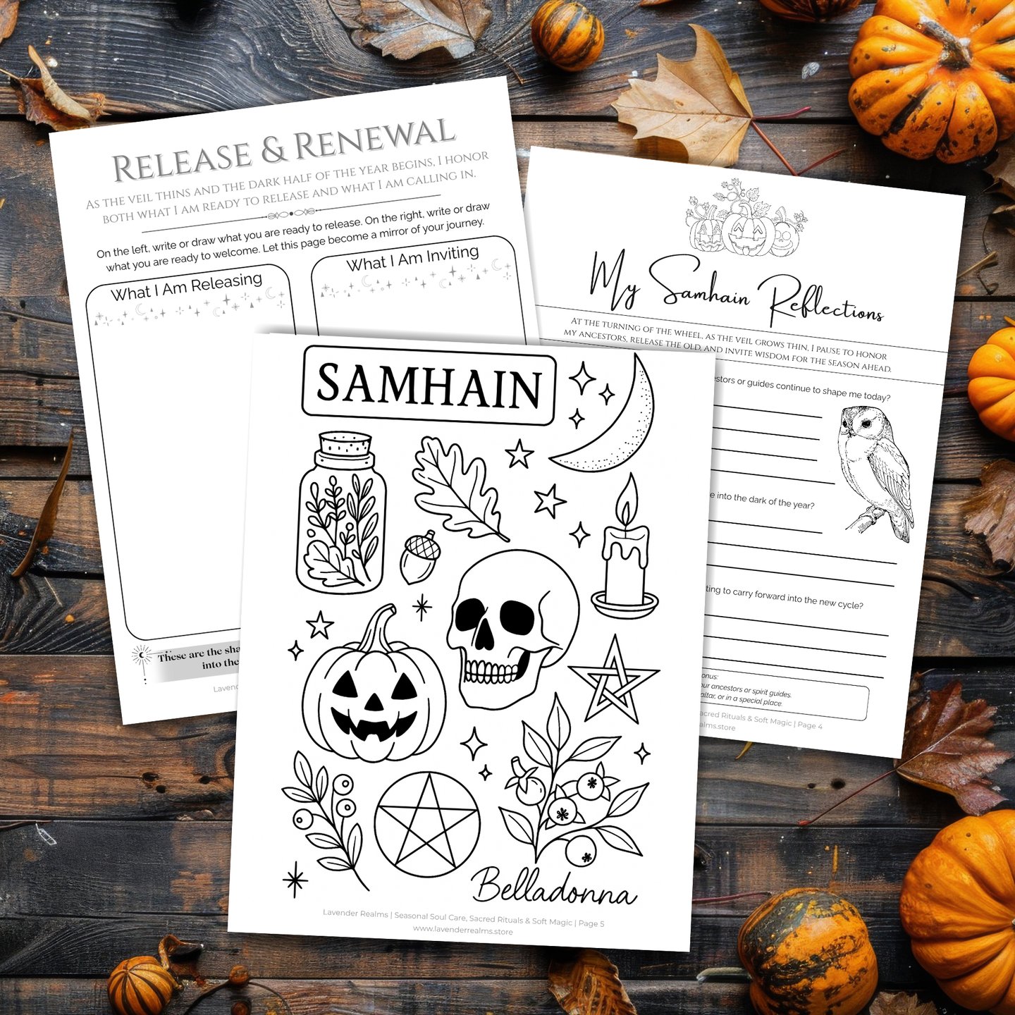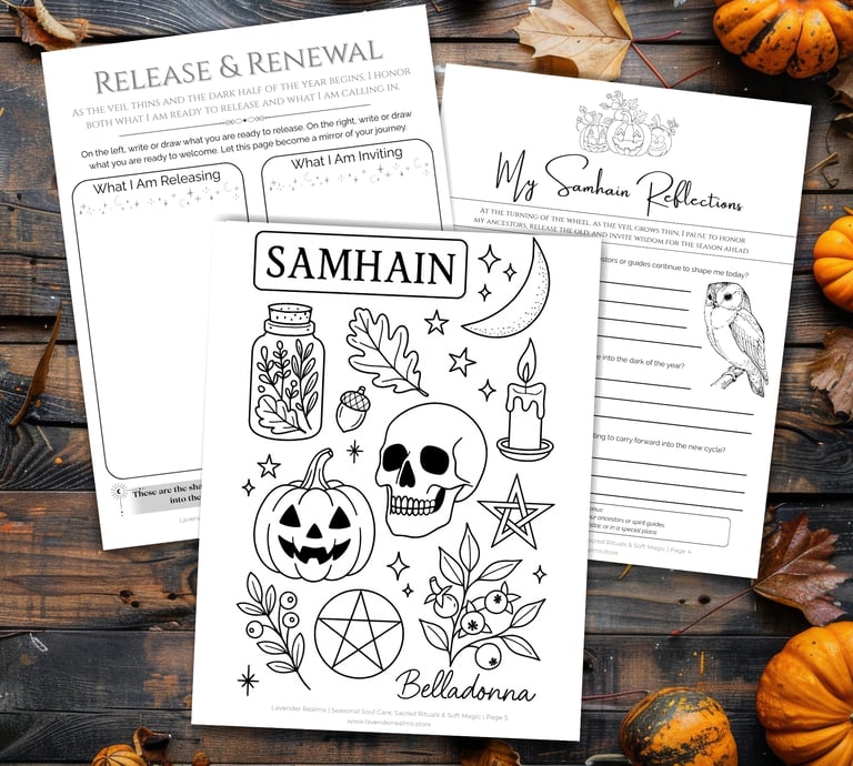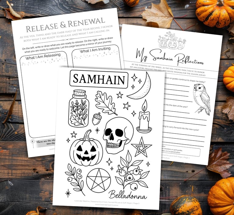 Includes three cozy coloring pages, a Samhain reflections page, and a release & renewal ritual.