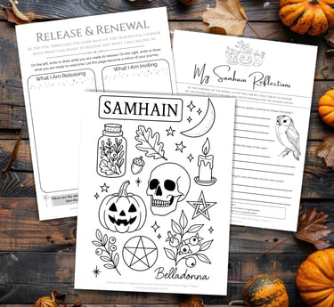 This free 5-page Samhain printable includes pages to color, journal, and reflect — inviting you to pause, release, and reconnect as the Wheel turns toward the dark half of the year.